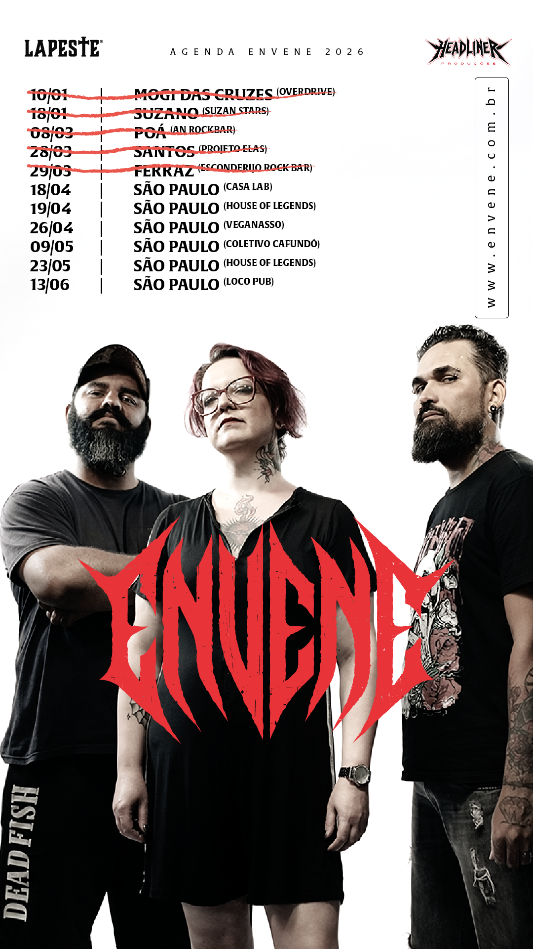 ENVENE é um power trio formado por Verônica Gonçalves (Baixo e Voz), Bruno Oliveira (Bateria) e André D'oro (Guitarra). Com uma sonoridade visceral, onde peso e melodia coexistem, a banda explora temas profundos, intensos e pessoais, com letras introspectivas, criando uma experiência catártica a cada canção.